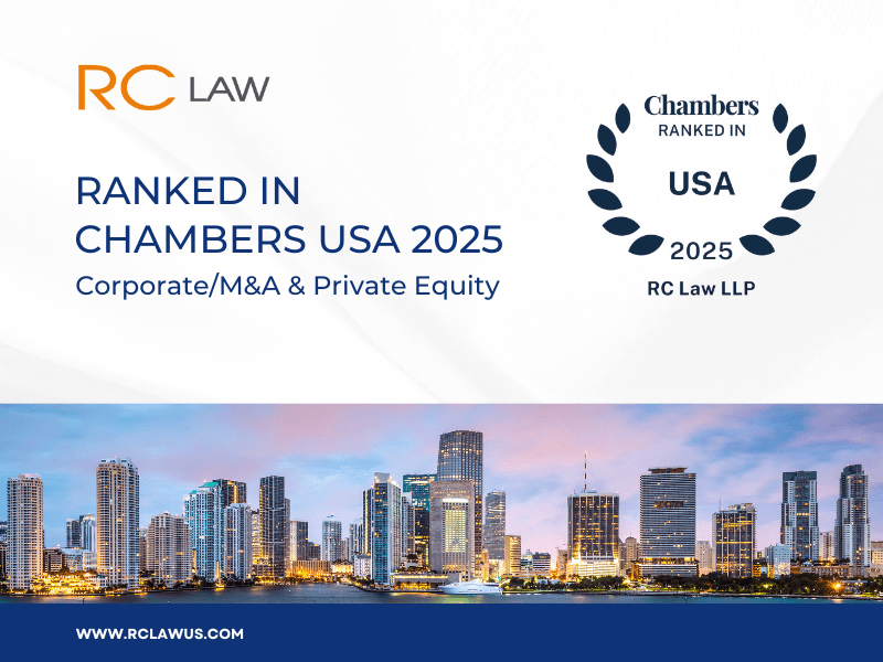 RC Law is proud to announce that it has been ranked in the 2025 edition of Chambers & Partners USA in the Corporate/M&A and Private Equity category for South Florida, marking the third consecutive year the firm has received this recognition.